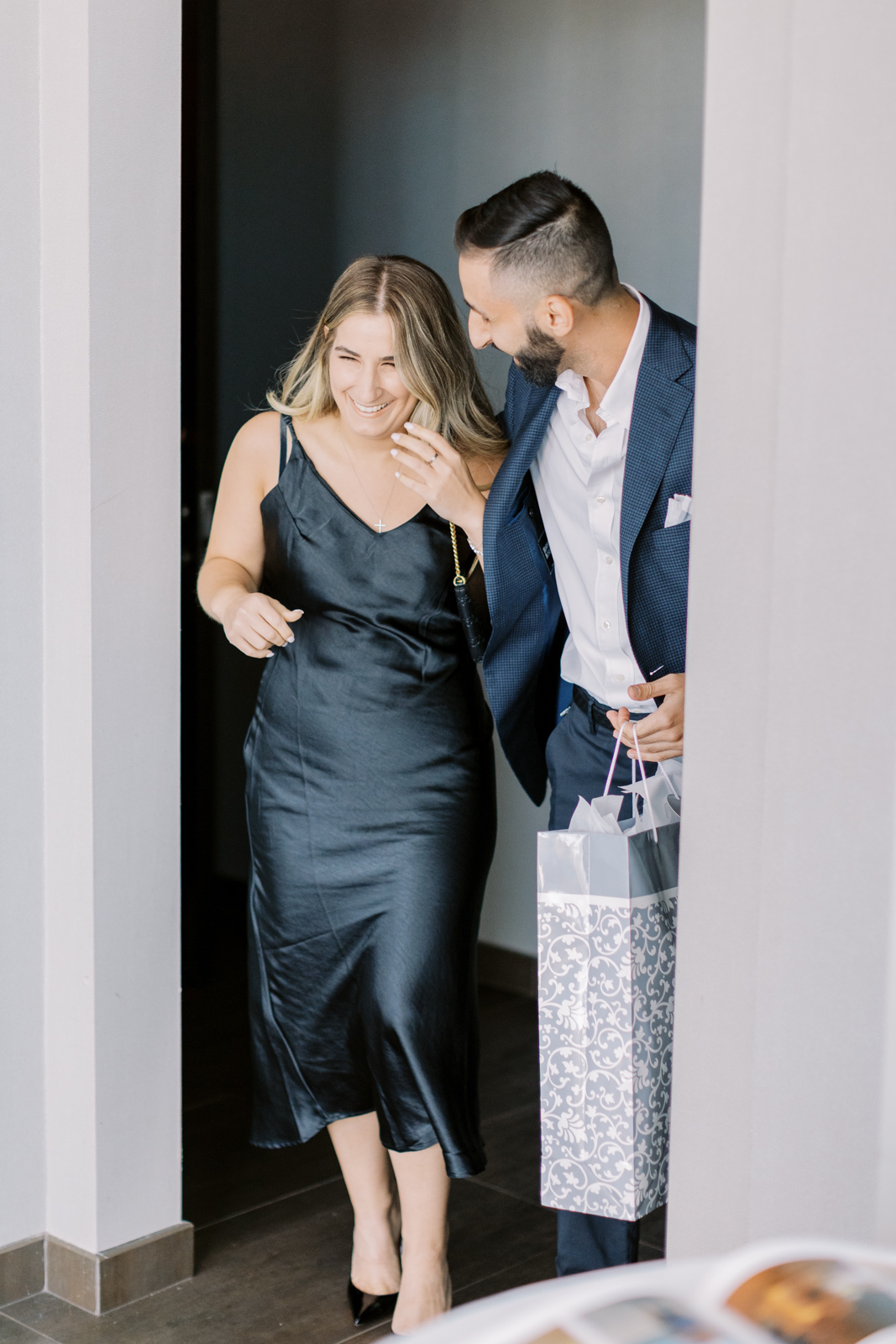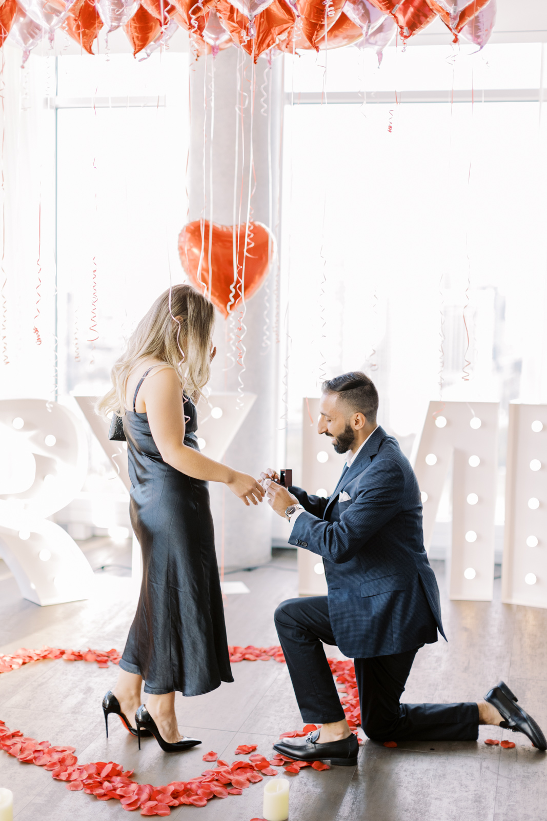 I have the feeling that Guilia knew the proposal was coming because she was dressed to the nines. They walked into the modern room where he had red heart balloons, rose petals and a “Marry Me” sign — a hopeless romantic style proposal that she said yes to.
