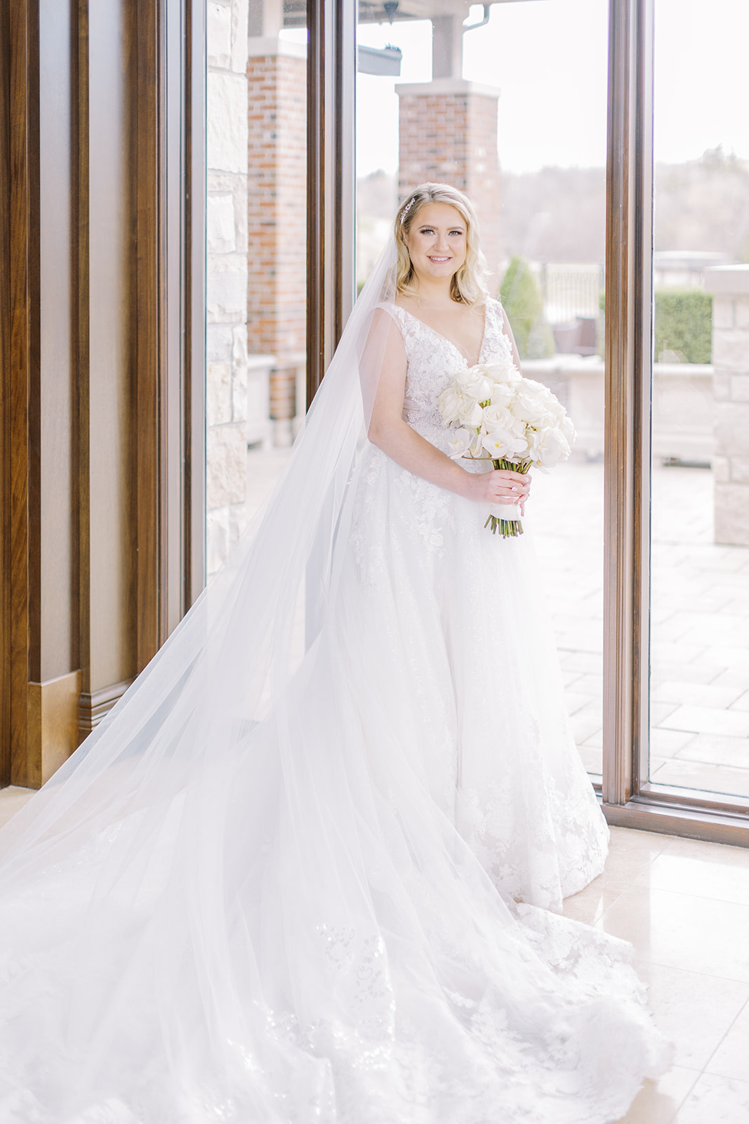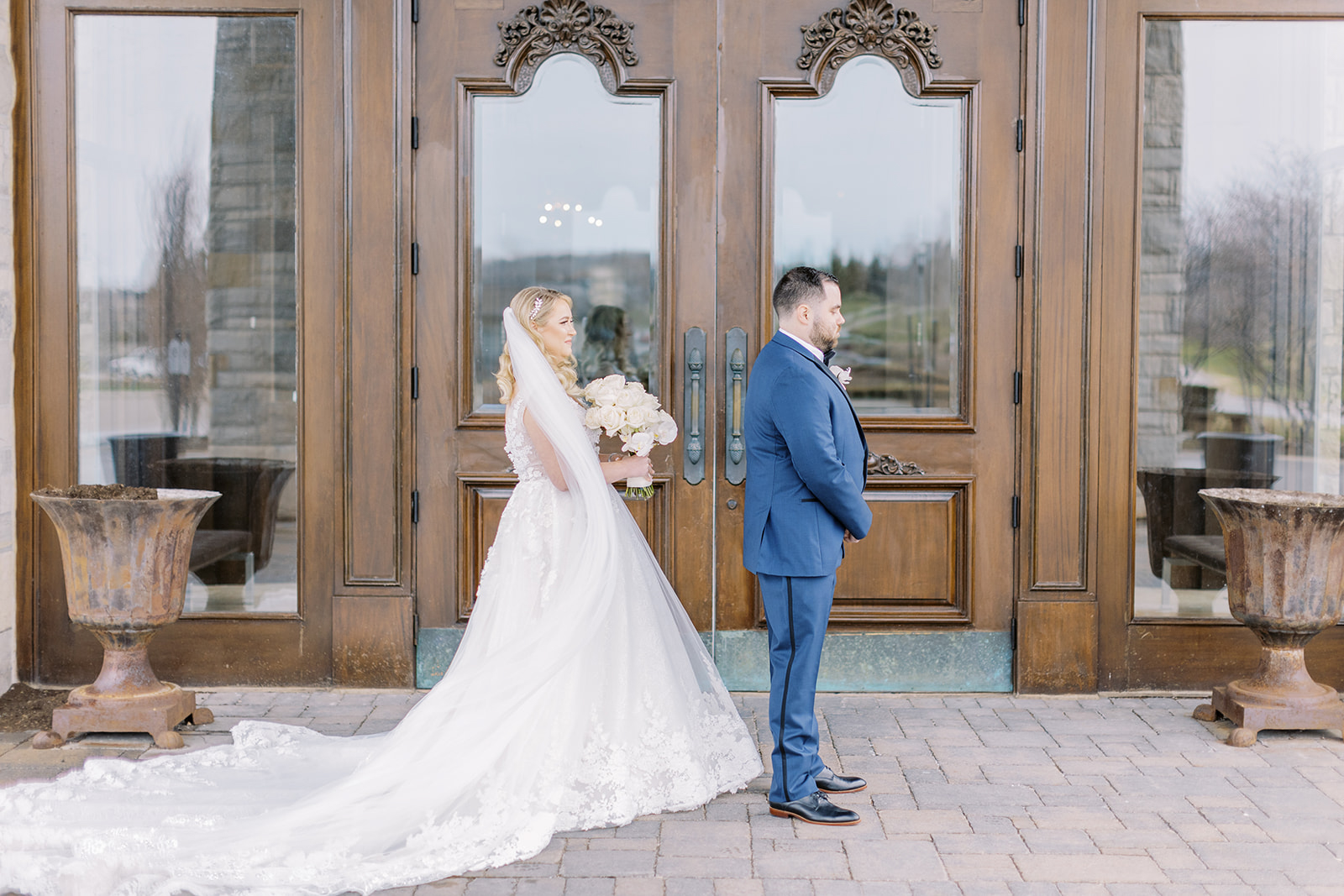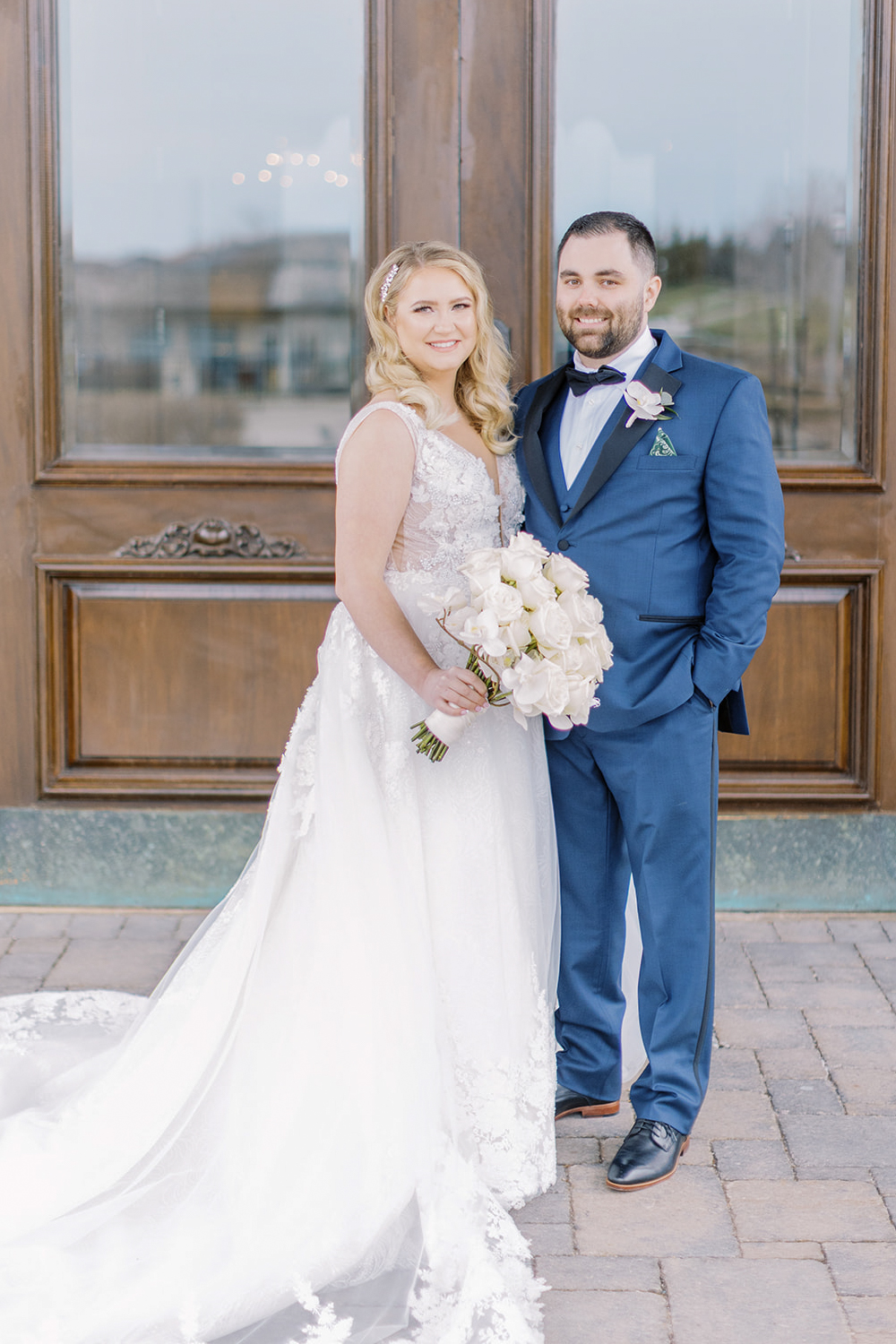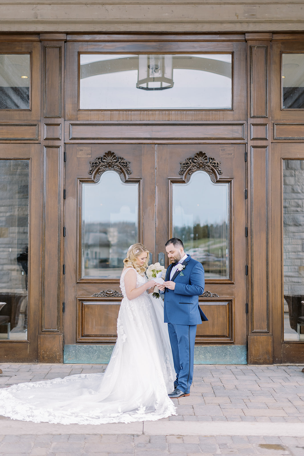 A lush landscape is the backdrop of this light-filled golf club in Ontario. The venue, with an abundance of space for over 250 guests, has oversized, arched windows with modern touches and a front entrance framed by no other than grand, wooden doors we used for the setting of our portraits.