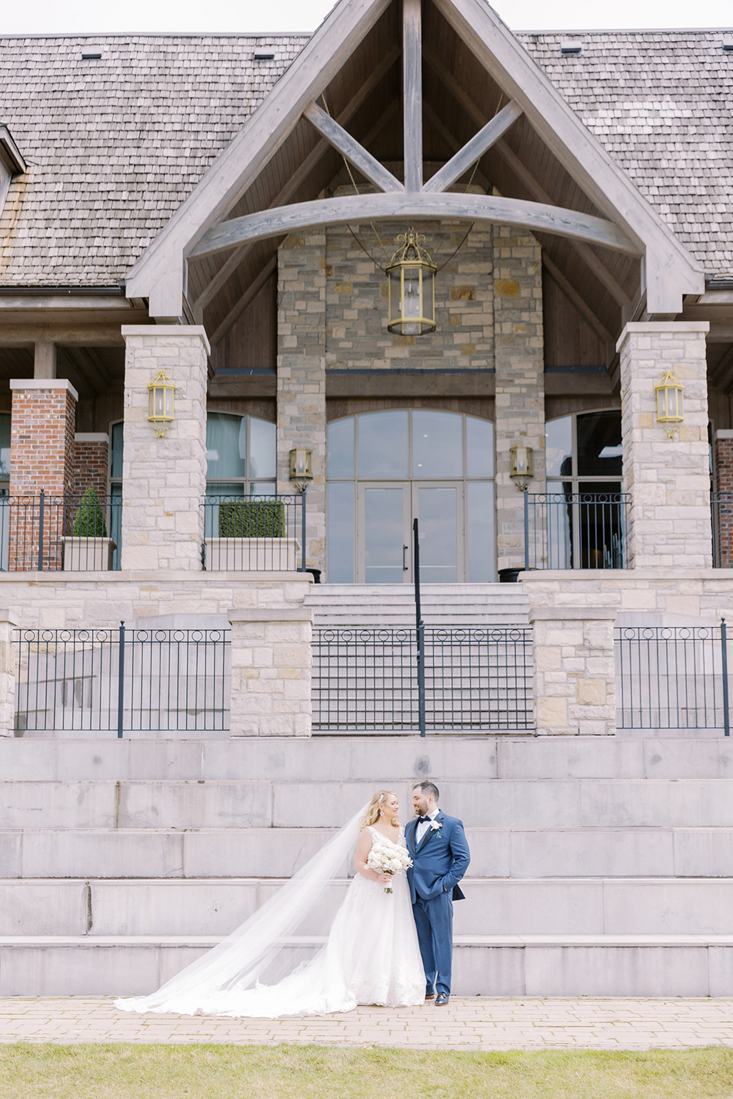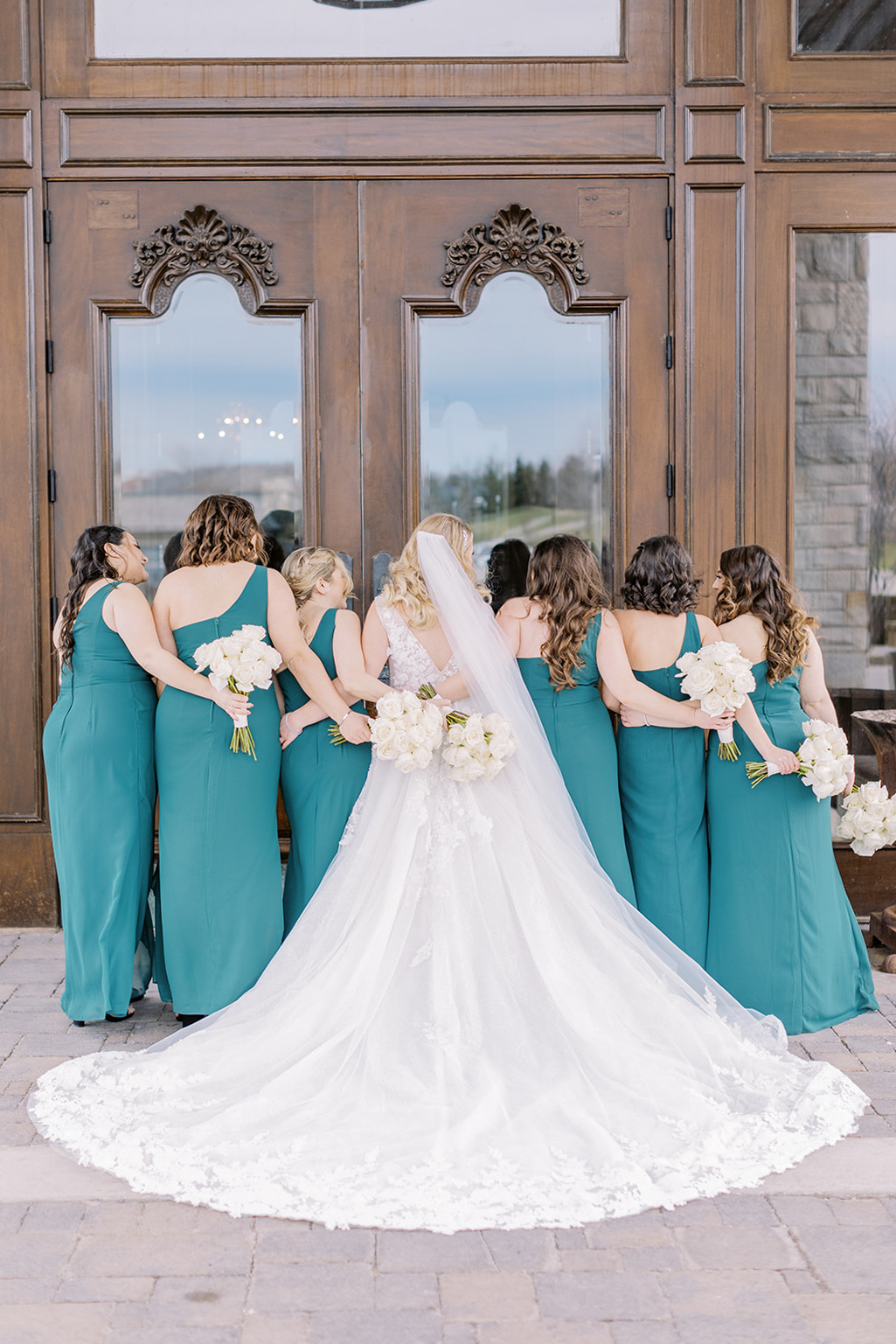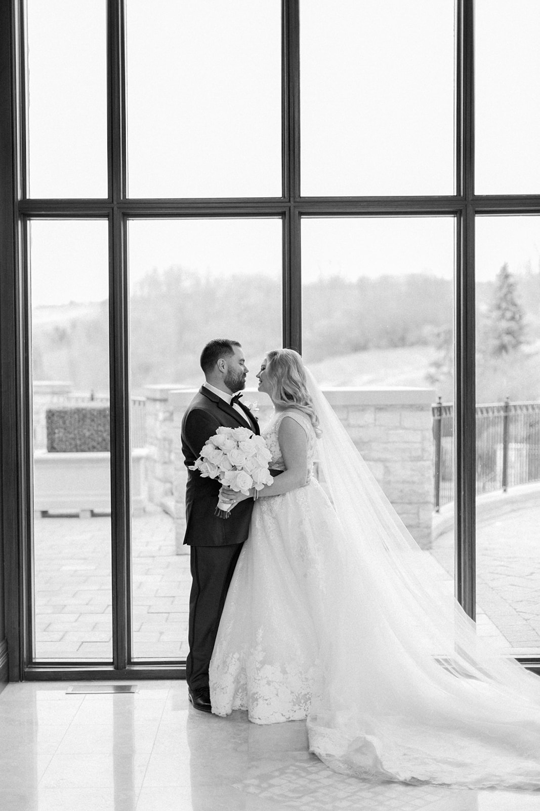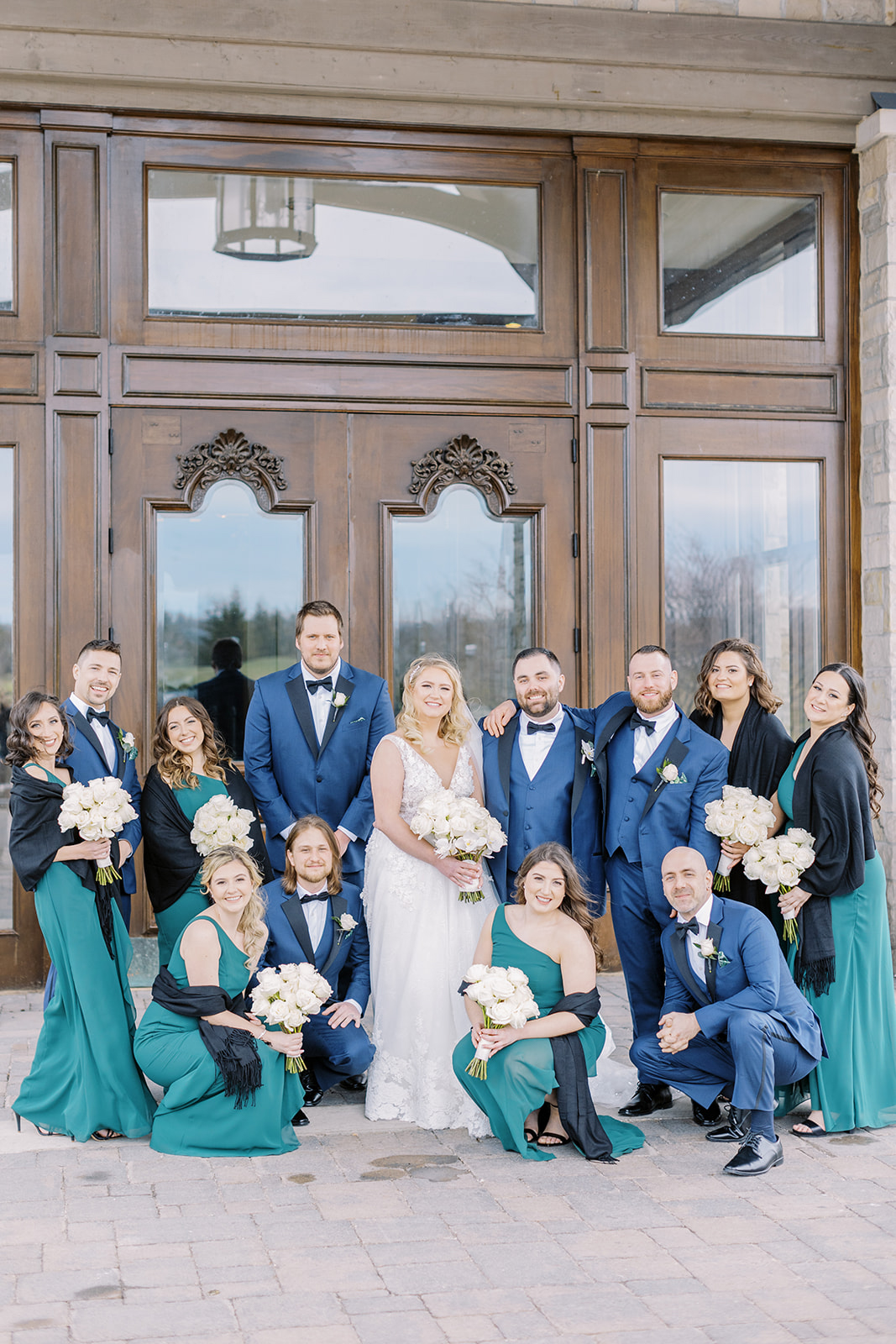 A lush landscape is the backdrop of this light-filled golf club in Ontario. The venue, with an abundance of space for over 250 guests, has oversized, arched windows with modern touches and a front entrance framed by no other than grand, wooden doors we used for the setting of our portraits.