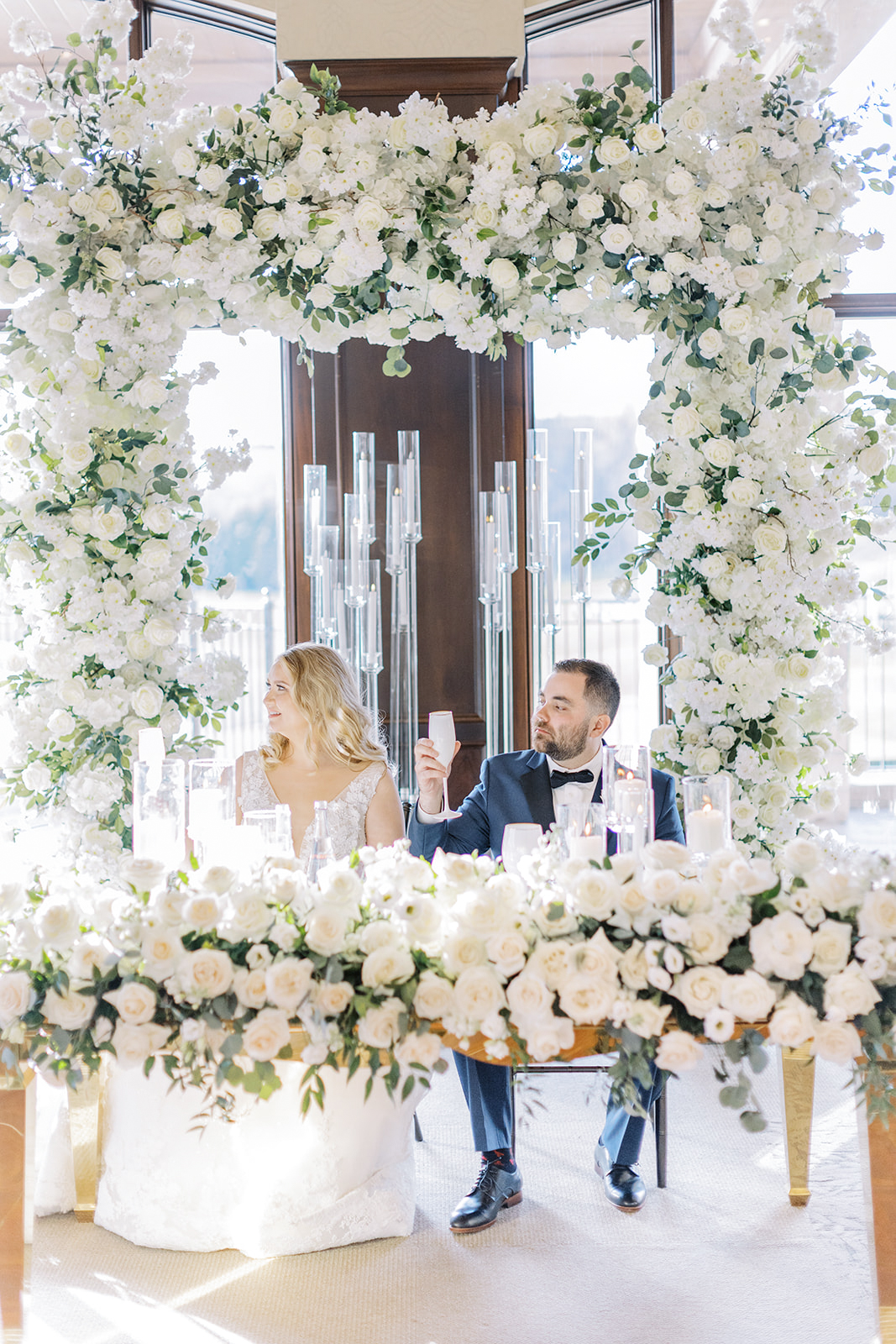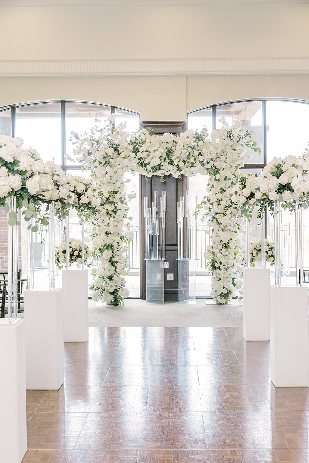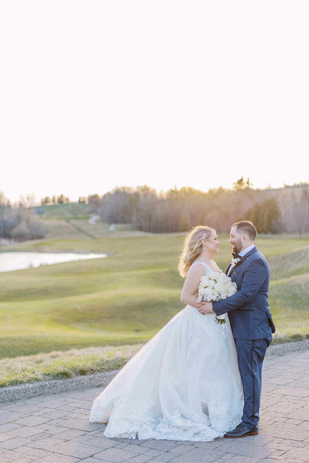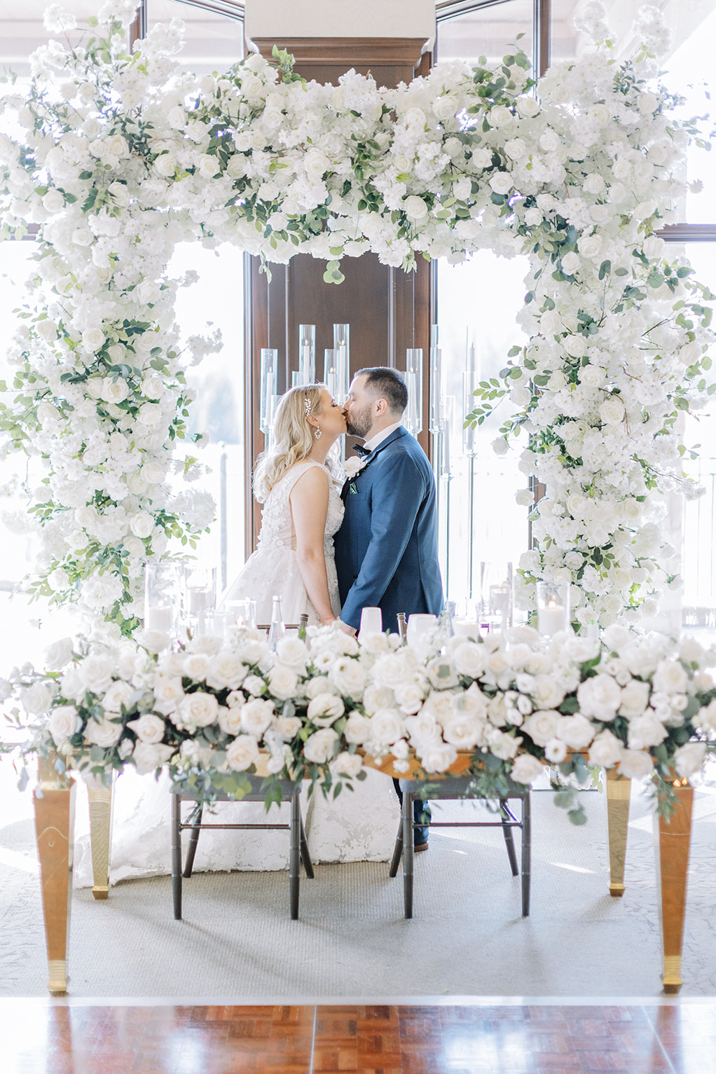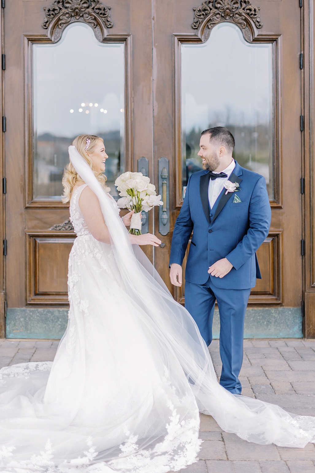 A lush landscape is the backdrop of this light-filled golf club in Ontario. The venue, with an abundance of space for over 250 guests, has oversized, arched windows with modern touches and a front entrance framed by no other than grand, wooden doors we used for the setting of our portraits.