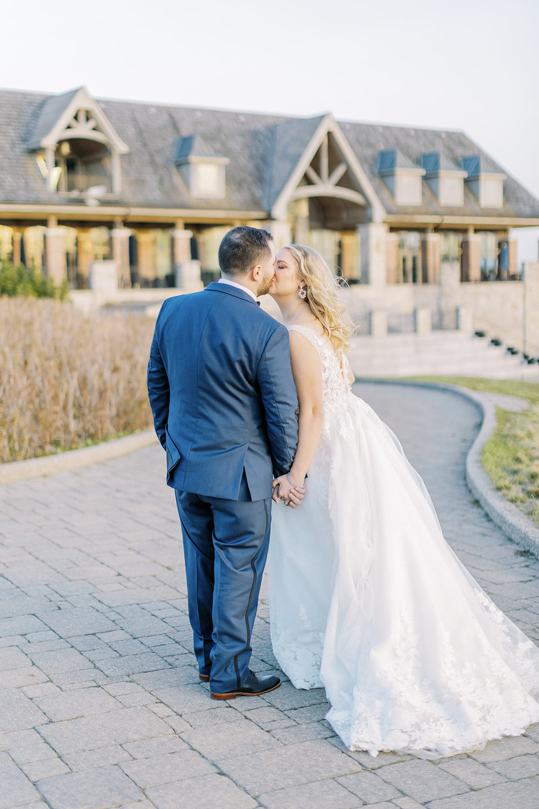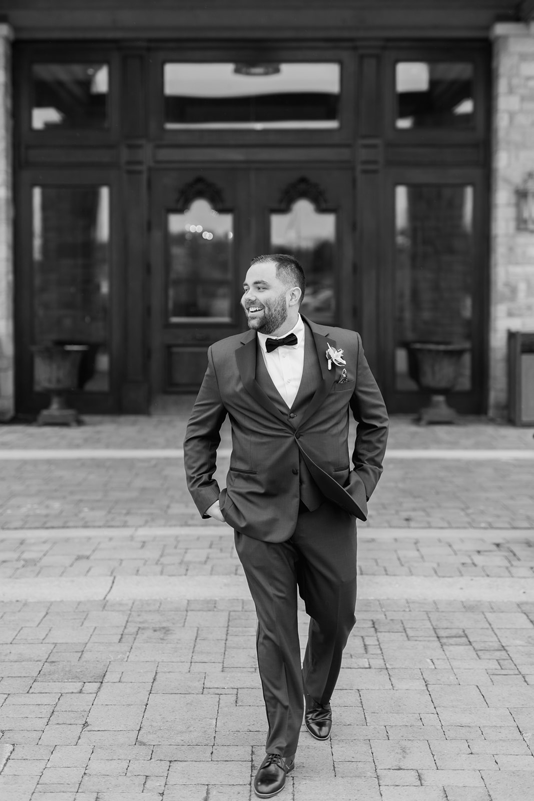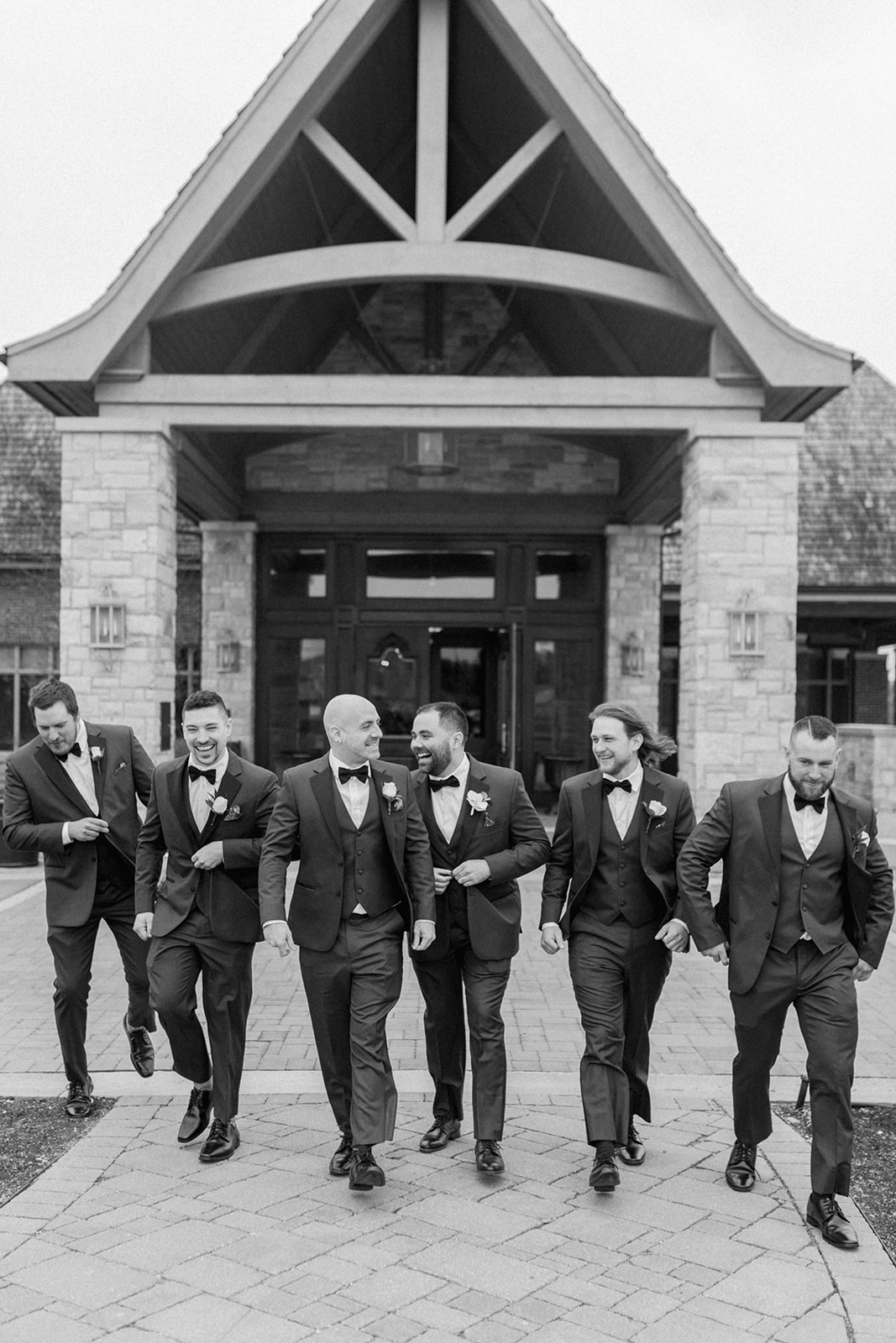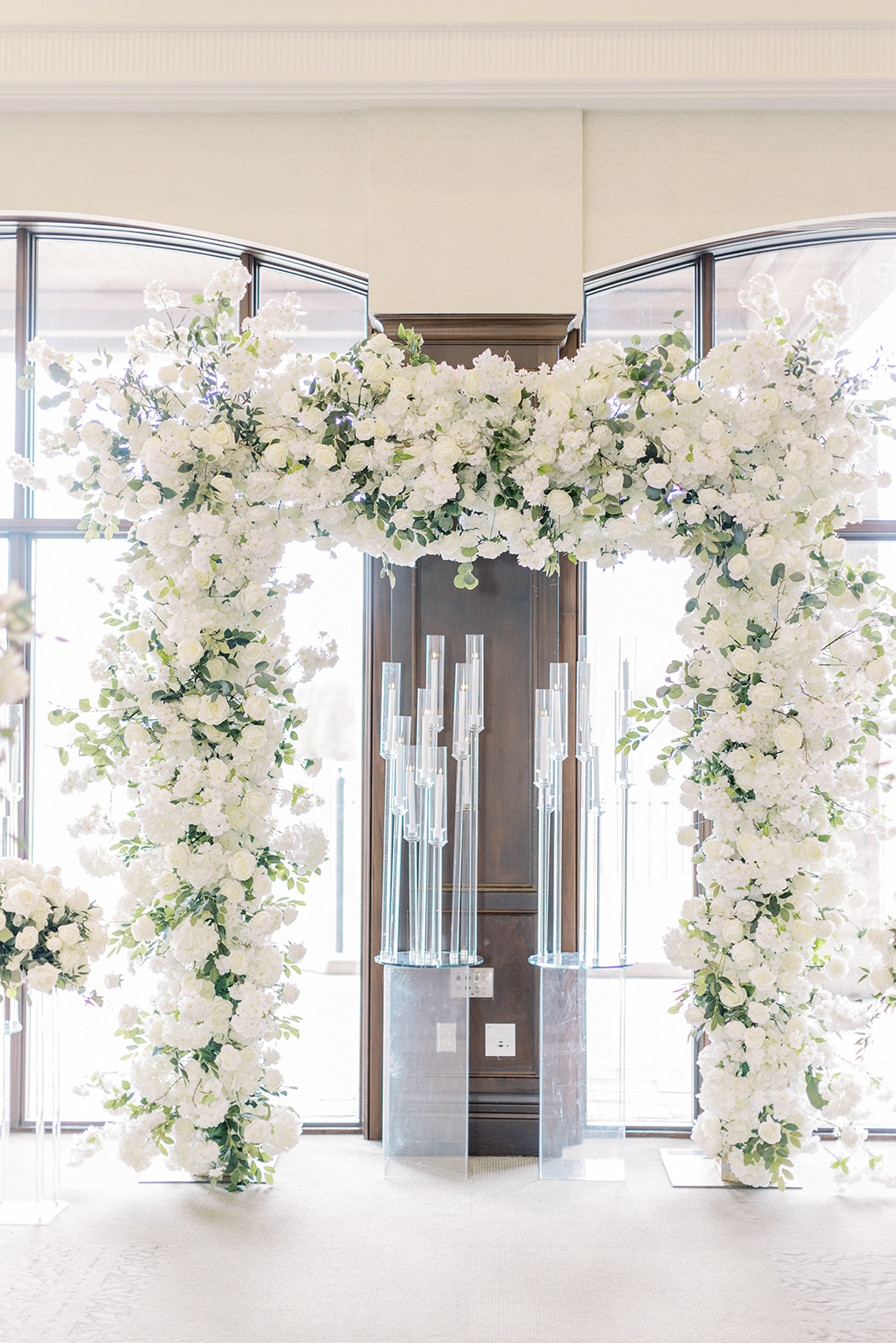 A lush landscape is the backdrop of this light-filled golf club in Ontario. The venue, with an abundance of space for over 250 guests, has oversized, arched windows with modern touches and a front entrance framed by no other than grand, wooden doors we used for the setting of our portraits.