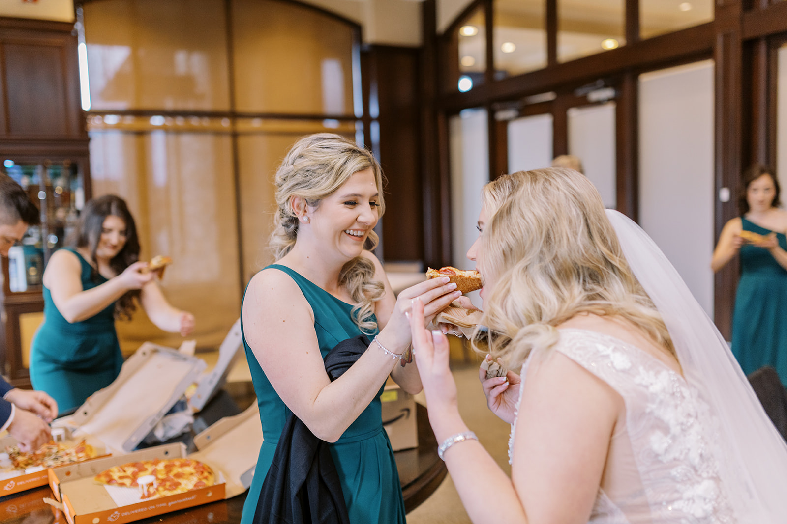 With a large bridal party, you sometimes have to keep things fun and interesting. So, they paused to enjoy pizza during the portrait session. (I also enjoyed a slice or two.) It’s pretty rare to have a pizza party in the middle of a wedding day, but I would vouch for more!