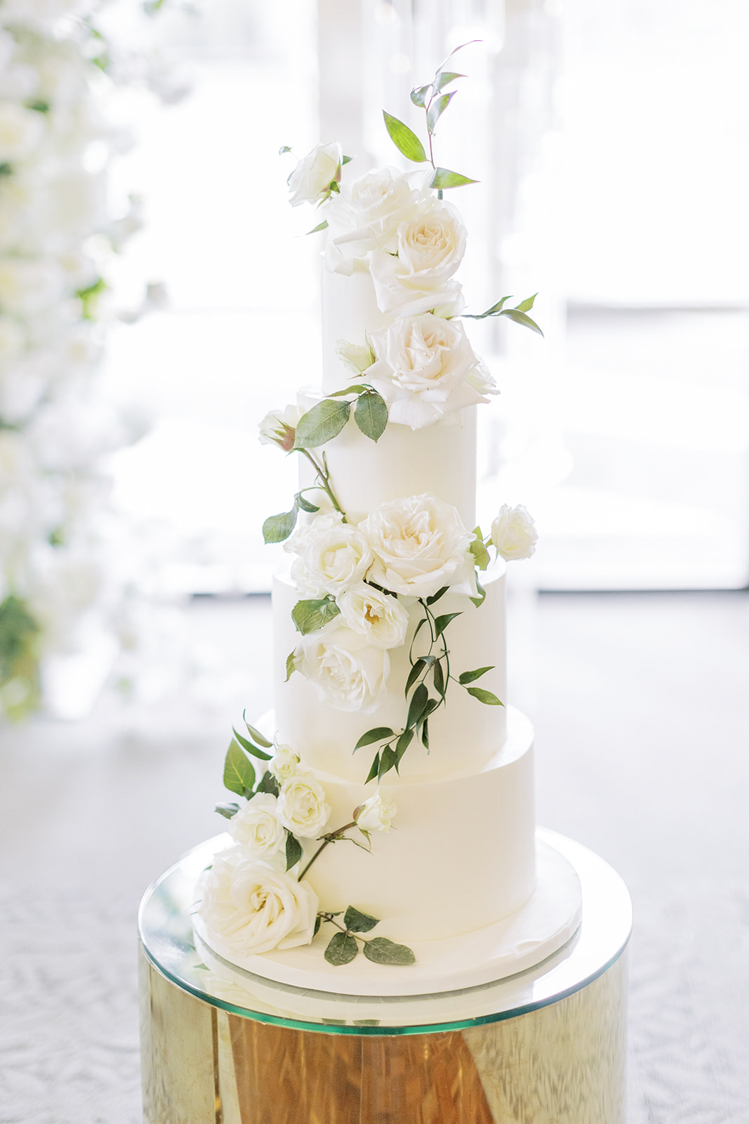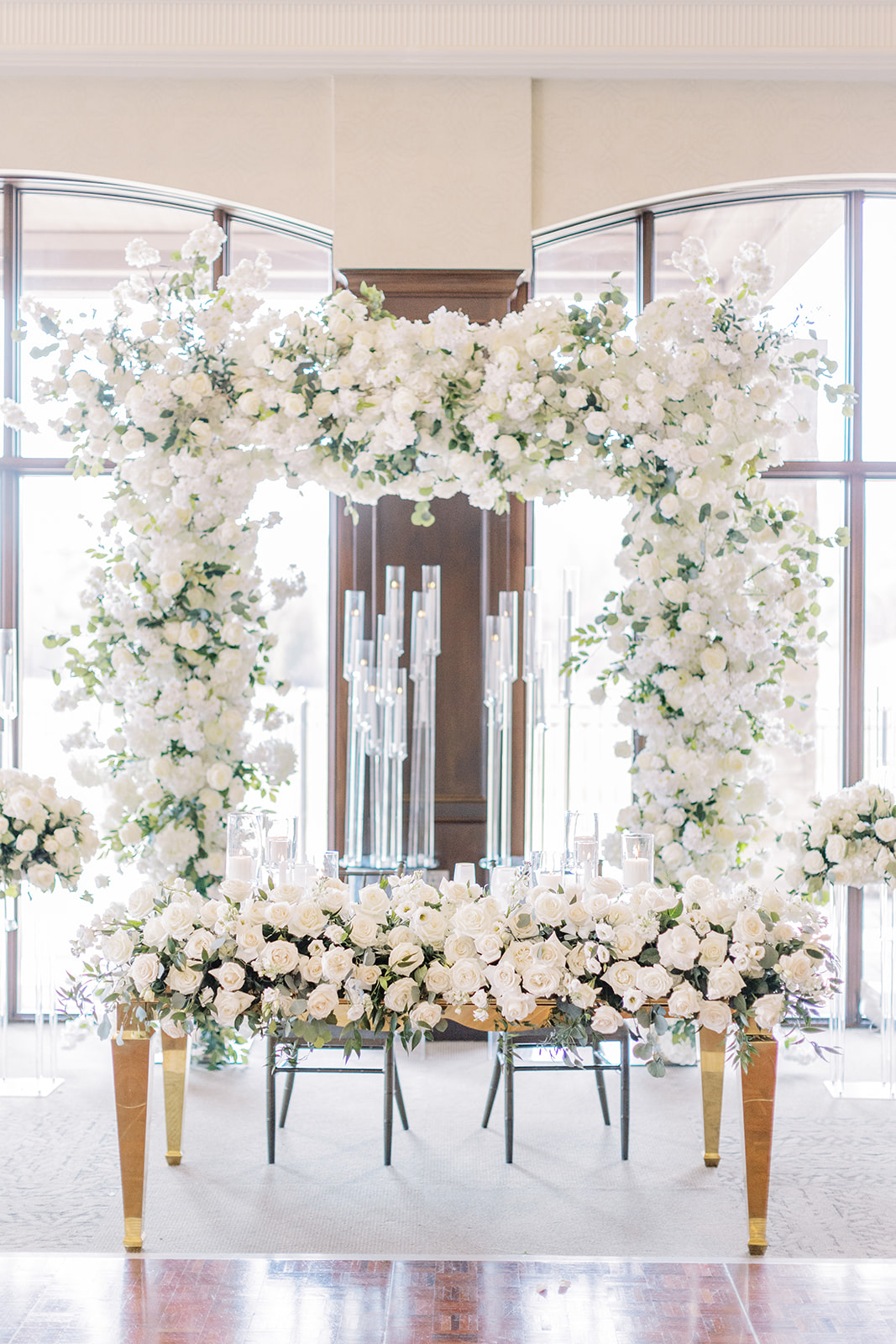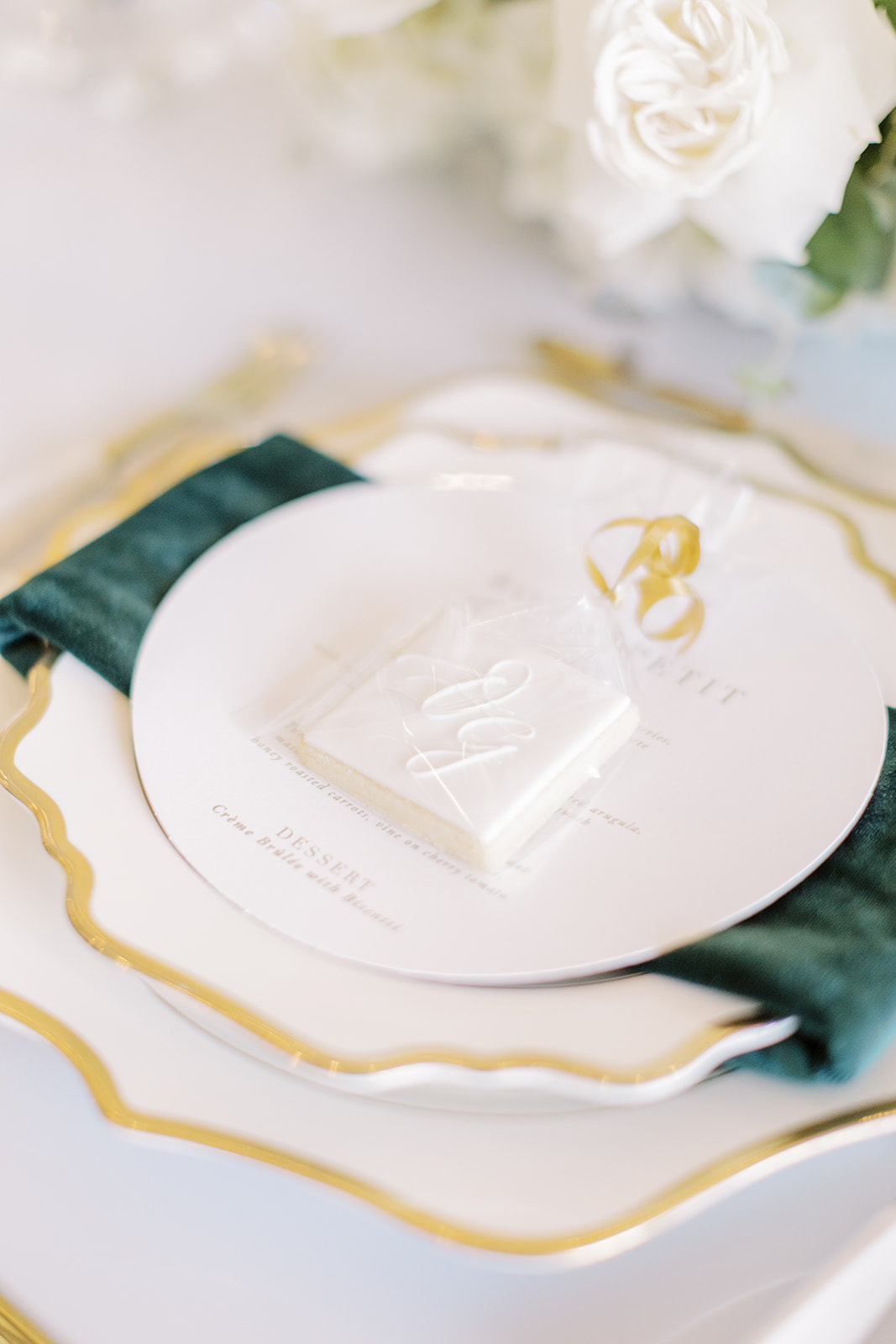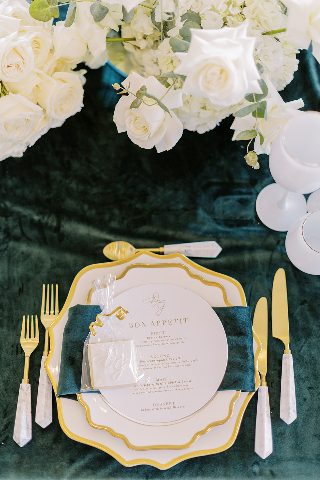 The velvet green tablecloths topped with overflowing white florals and golden flatware created a sensational look. Flowers also served as an archway for the ceremony which was then used as the backdrop for the head table.