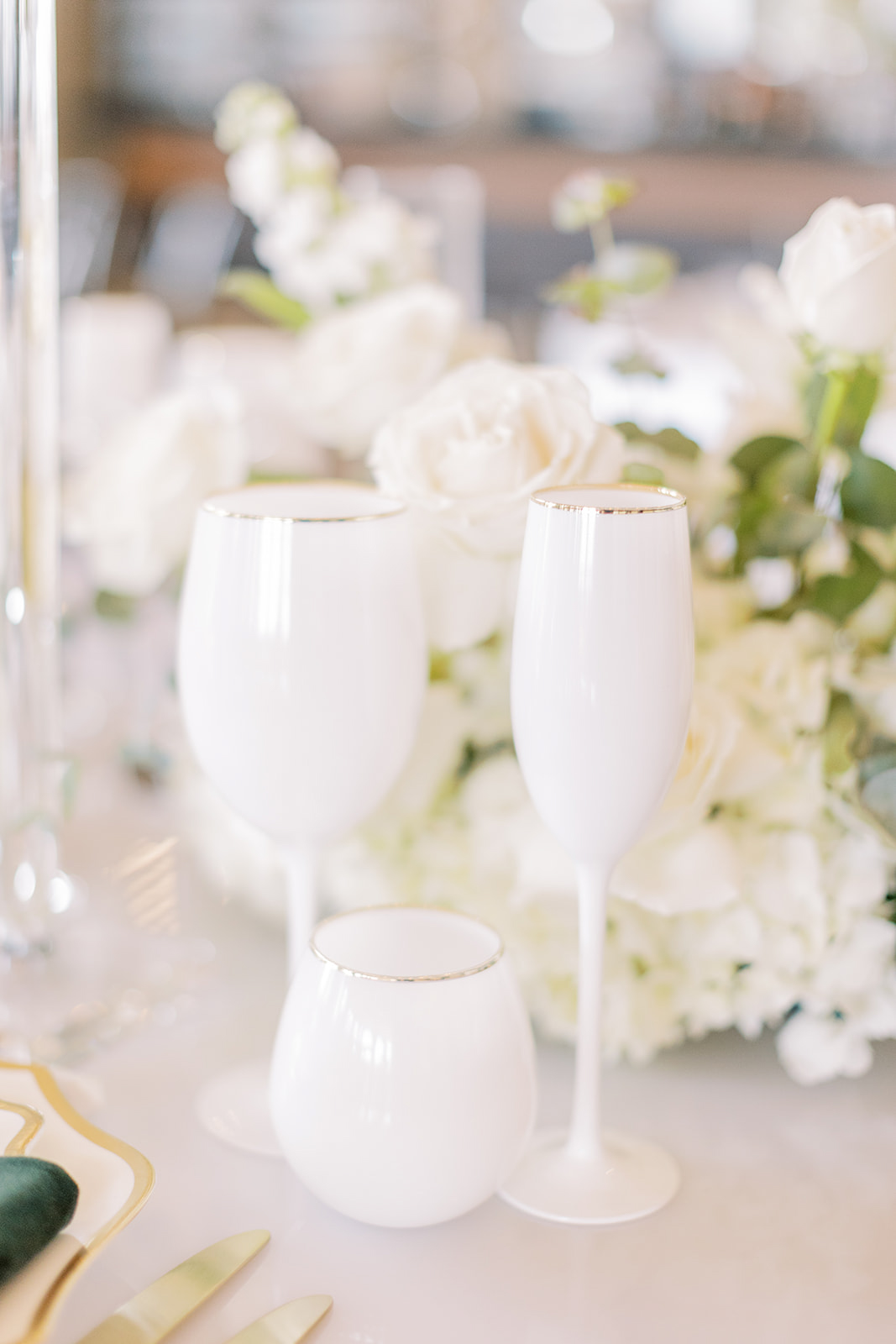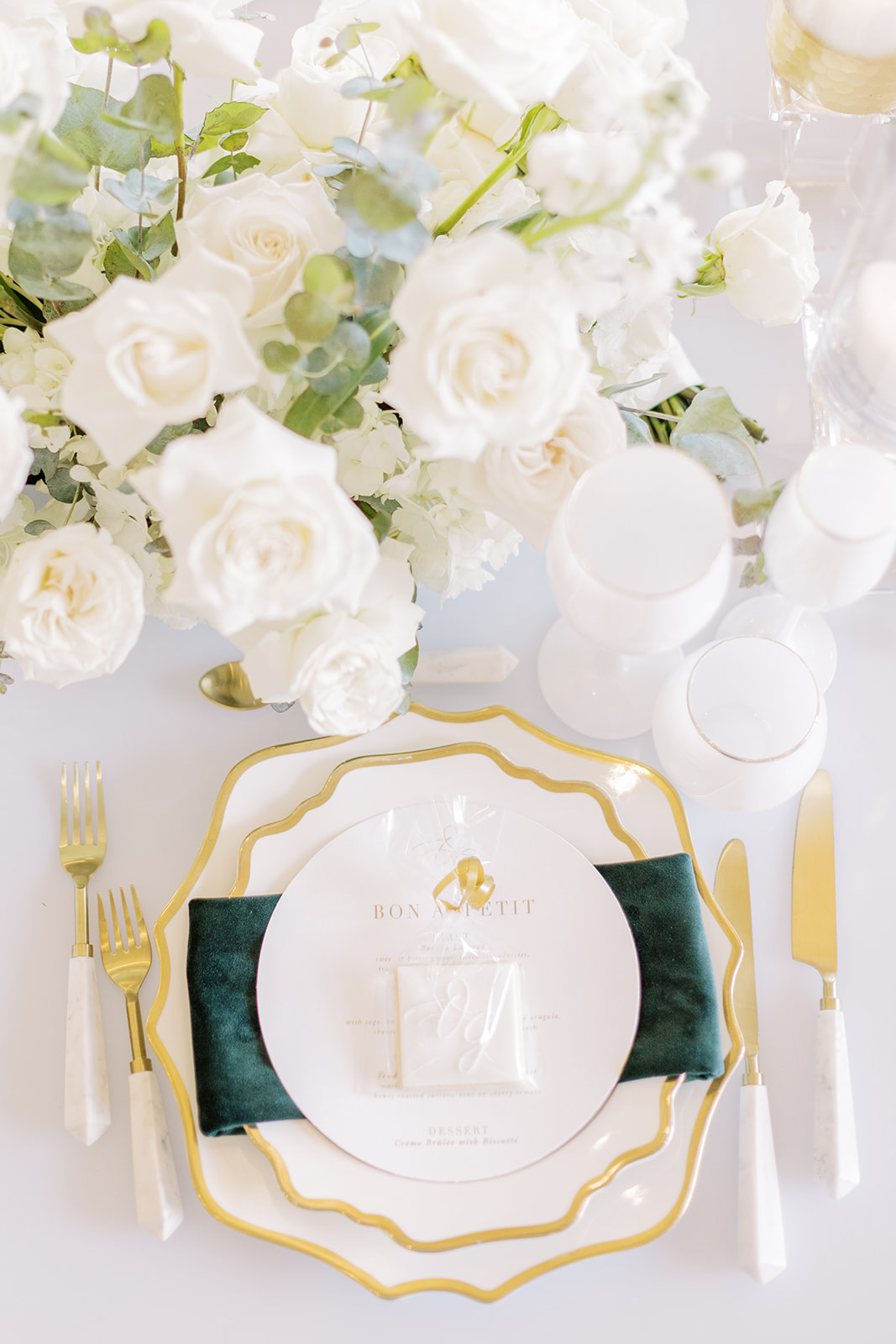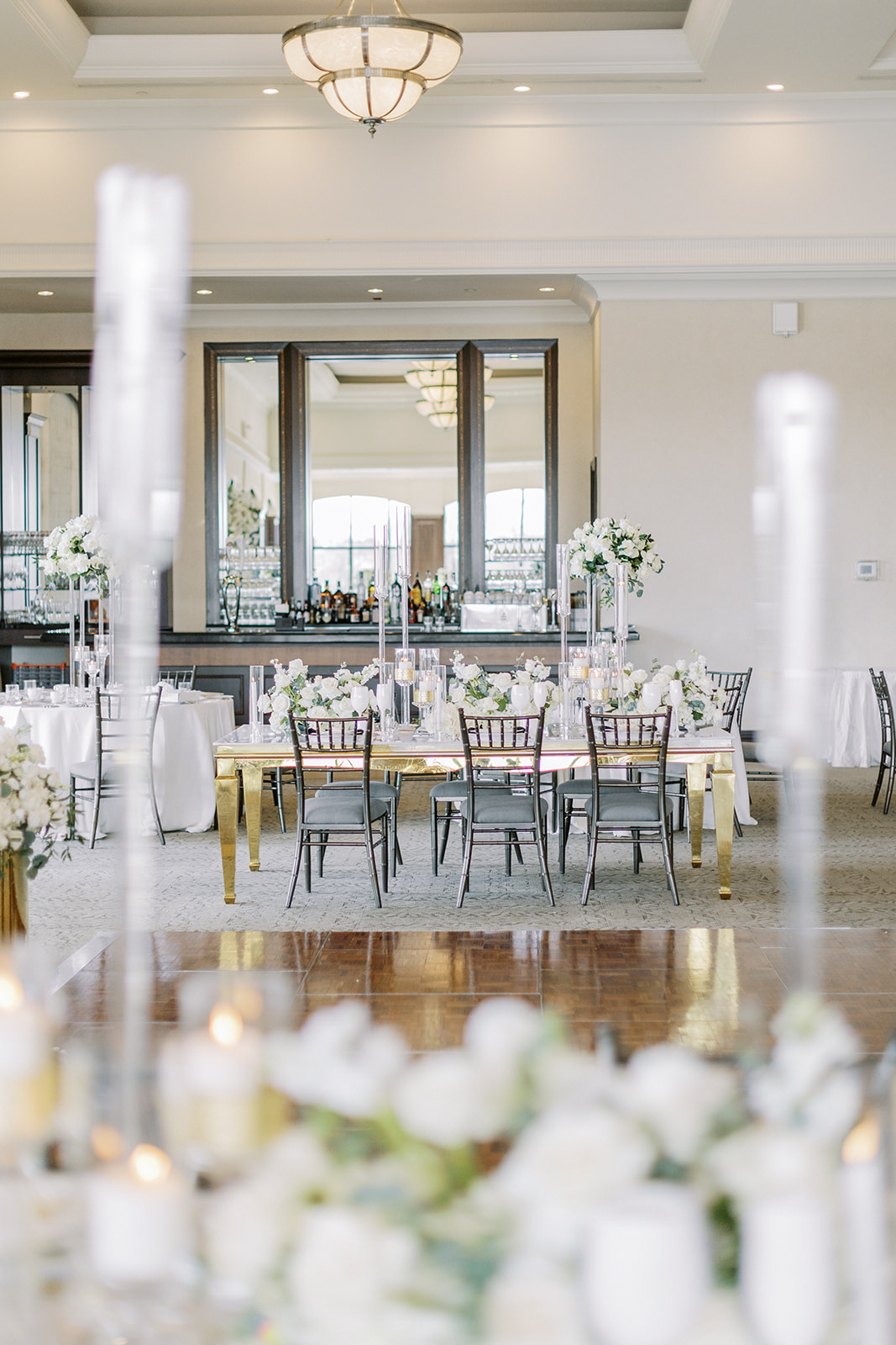 Emerald green, complemented with classic white florals on a sprawling golf course wedding venue with classic, gold-brushed tablescapes at the reception — this Eagles Nest Golf Club wedding is the epitome of fine art wedding photography.